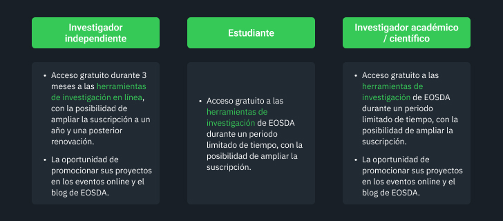 El programa permite a los participantes acceder a los principales productos de la empresa: EOSDA LandViewer, una herramienta de procesamiento de imágenes satelitales en tiempo real. EOSDA Crop Monitoring, una plataforma en línea impulsada por datos de satélite para una gestión remota del campo, y optimizar los procesos de investigación académica y científica mediante el uso de datos satelitales de alta calidad. Además, los investigadores que se adhieran al programa tendrán la oportunidad de promocionar sus proyectos en los eventos online y el blog de EOSDA.